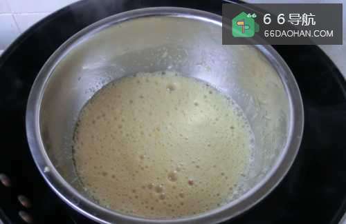 2先将蛋液打至粗泡,锅里加水烧热后关火,将鸡蛋盆放进去,也可直接将热水倒入一个大盆里,然后放上鸡蛋盆。