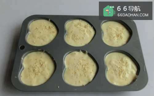 8蛋糊倒入模子中,8分满,6联模一套撒上少许白芝麻点缀。