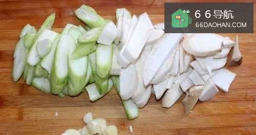 2将丝瓜和杏鲍菇切片,蒜切片备用。