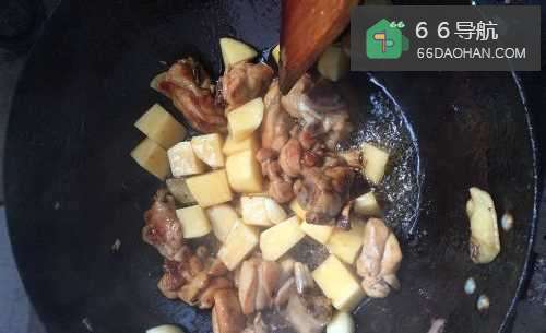 凉锅凉油放入冰糖,不断搅拌,防止糊锅,冰糖炒到糖泡下去后及时放入鸡块翻炒,至全部上色