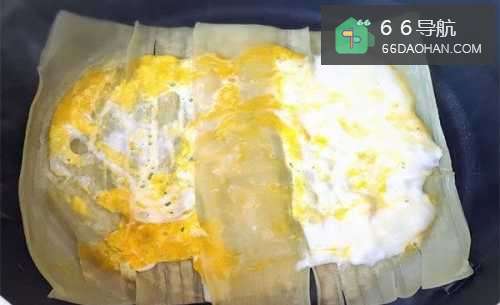 3鸡蛋在面饼上慢慢受热,用筷子轻轻搅拌摊开,同样注意不要流到面饼外,摊开后稍稍等待一下,等鸡蛋凝固或者半凝固。