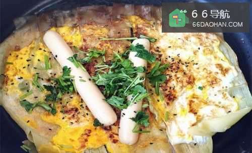 5此时面饼部分已经基本制作完成,再向其上放入之前准备好的香菜、芝麻和肠,之后将面饼卷起出锅,再用刀切分即可。