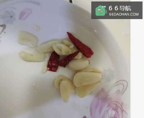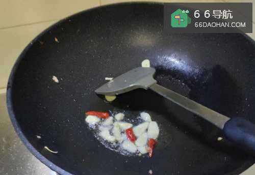 3锅里加入油后放入蒜头、干辣椒翻炒出香味,如图