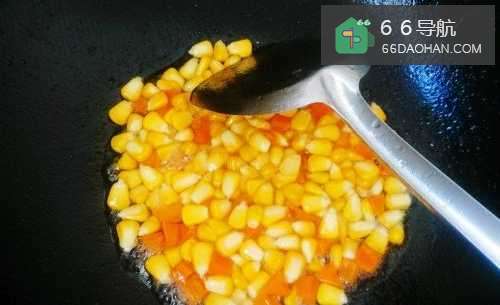 4倒入玉米粒和胡萝卜丁翻炒至糖汁变少,随即勾入芡汁。