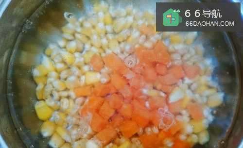 2锅中注水烧沸后,滴两滴食用油,把玉米粒和胡萝卜丁先倒进去焯两分钟,然后捞出沥水。