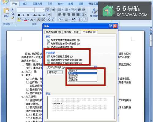 可勾选【允许行首标点压缩】、【自动调整中文与西文的间距】、【自动调整中文与数字的间距】;点击【文本对齐方式】,可选择居中、基线对齐等,在这里选择【居中】。