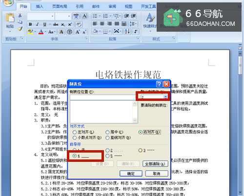 8在【制表位】内,选择对齐方式、前导符等。