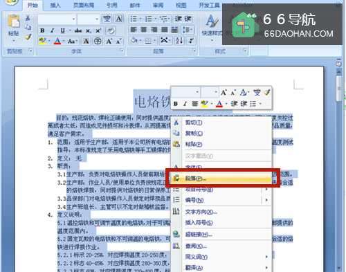 3右击鼠标,在弹出选项中,选择【段落】。