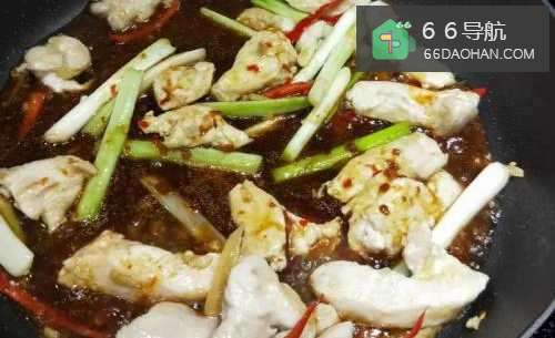 4拌炒至鸡肉呈黄色后倒入刚调好的调味料,开大火炒