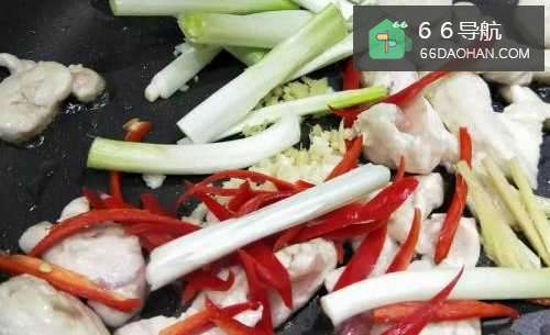 3鸡肉炒至变白后放入,蒜末,葱白,姜丝,辣椒丝继续拌炒出香味