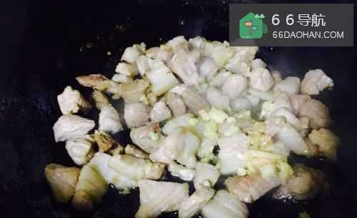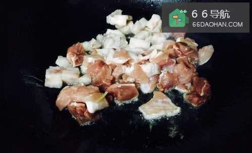 5肉丁翻炒大约两分钟后没有血色了即可放入姜末继续煸炒,将肉丁的肥油全部炒出来。
