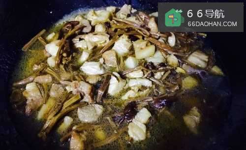 7翻炒2分钟后放入一碗水,水量尽可能的接近没过菜本身,开大火焖煮,待水还剩三分之二的时候转小火焖煮。