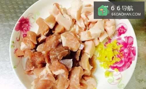 3接下来就是将前腿肉切成丁,茶树菇切成小段,姜片切成末备用。