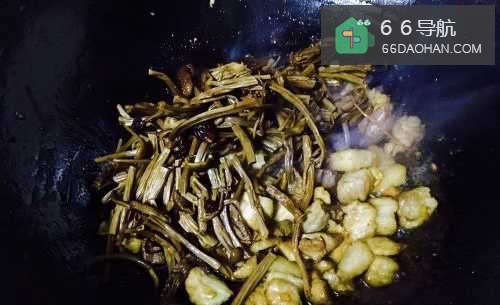 6加入酱油和生抽之后,肉丁上色,香味出来之后放入切好段的茶树菇开大火进行翻炒。