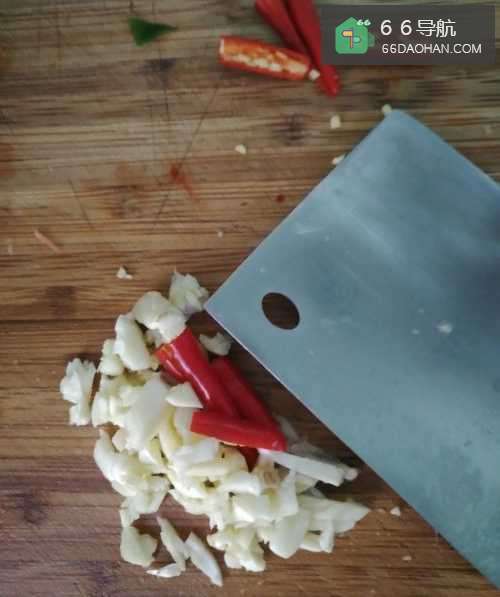 2第二步,准备好蒜和红辣椒,把蒜切碎。