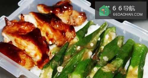 11最后将米饭铺到饭盒中,然后在米饭上放上秋葵和照烧鸡腿排即可。