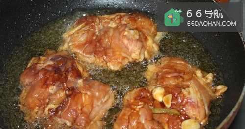 3锅中放油,将腌制好的鸡腿排放入锅中煎熟,然后捞出沥油。