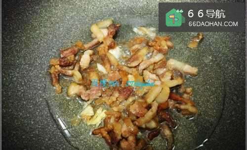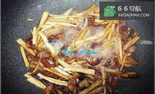 6一会重新加入腌制的三层肉,同时加入茭白丝混合翻炒。