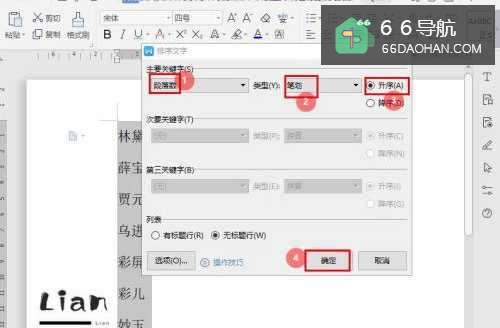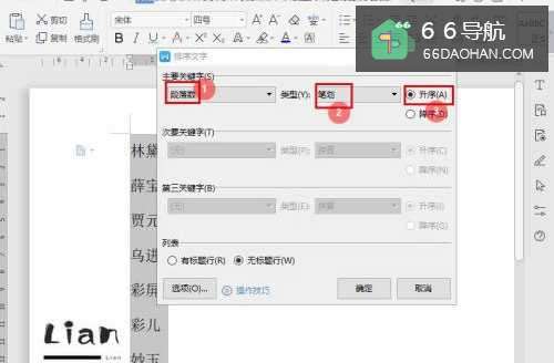 3在“排序文字”对话框中,进行【排序设置】,如下 ;