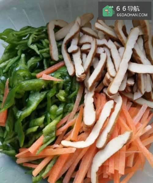 2然后将三道食材都切成大小差不多的丝儿,放在一起。
