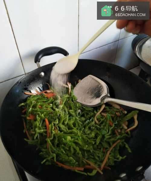 5在翻炒到9成熟的时候,再放入食盐小半勺。