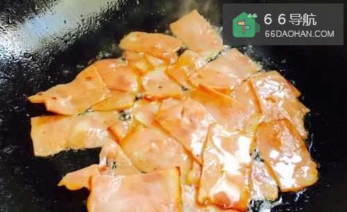 3锅烧热后加入少许油,因为培根本身油脂量就比较高,所以不需要太多油,油温至8成热的时候放入培根。