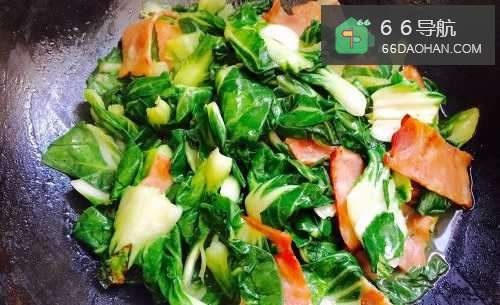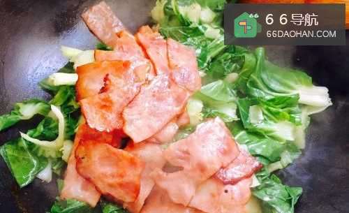 7青菜叶子全部被炒变色,呈现翠绿色之后即可把刚刚煎好的培根倒进去继续翻炒。