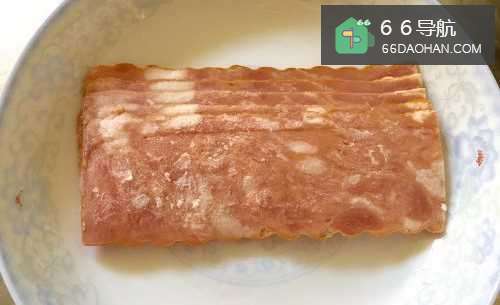 4带培根一片片的被油煎至呈黄色的时候,即可用筷子夹出来,放在盘子里备用。