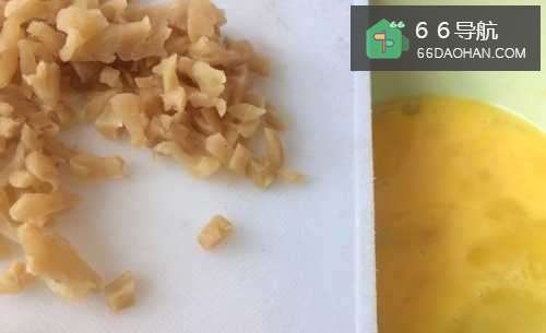 3接着将切好的菜脯粒倒入装有鸡蛋的碗里。