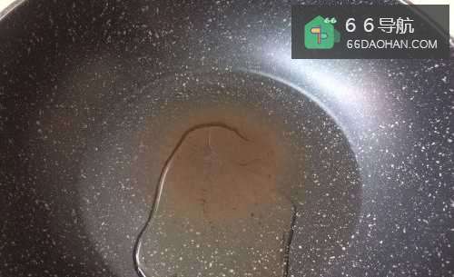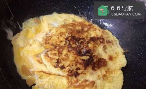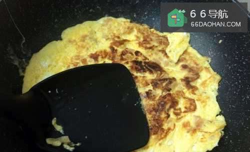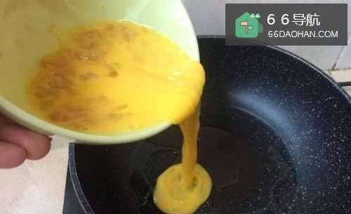 5预热好了后,将鸡蛋混合菜脯粒倒入煎锅。