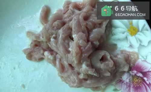 2猪肉切好了,放进盘子里,加入盐,油和淀粉抓均匀,腌15分钟左右。