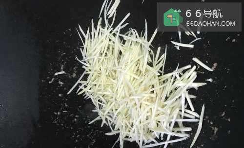 5接着把河笋丝放入炒锅,翻炒均匀。