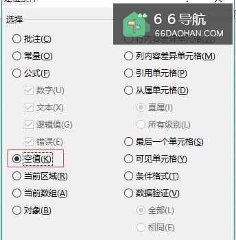 7在“定位条件”窗口,选择“空值”后点击确定。