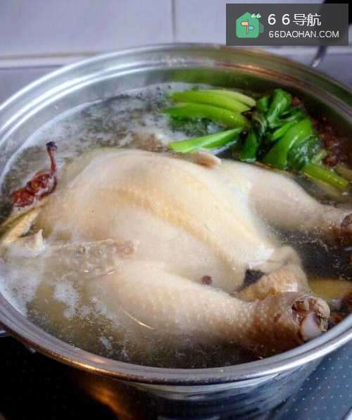 2将鸡冷水下锅,水开后撇净浮沫,加入料酒、葱姜、大料半个、花椒数粒加盖煮开15分钟,关火再焖10分钟。
