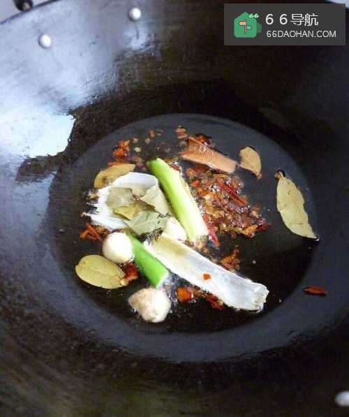 5锅中加适量油,放少许葱段、姜片、蒜片、桂皮、香叶、花椒、大料小火加热至香。