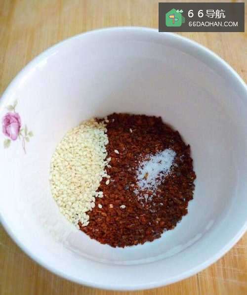 4准备红油将红辣椒粉、芝麻、盐放碗中。