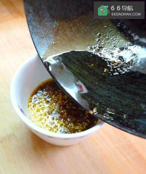 6然后用漏勺捞出配料,将油冲入辣椒碗中,再将碗上盖一个碟子焖一下。