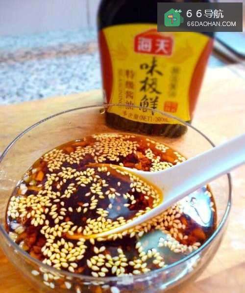 7将蒜蓉、酱油、醋、糖、盐、红油及少量的鸡汤混合成调味汁
