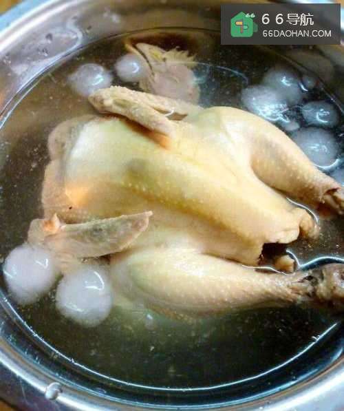 3将煮好的鸡全部浸入冰水里,待完全冷却后捞出,晾干,表面可以刷一层麻油。