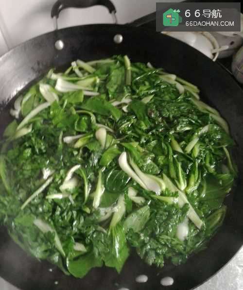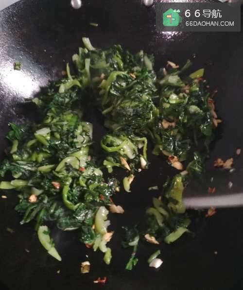 6第六步,然后倒入切好的蓬蒿和青菜翻炒。