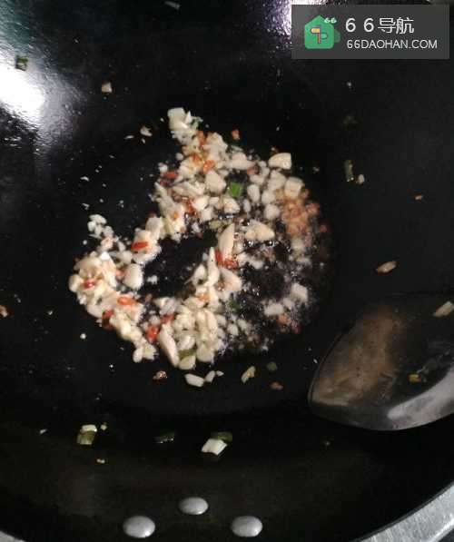 5第五步,等锅里油熟了以后倒入蒜和红辣椒炒香。