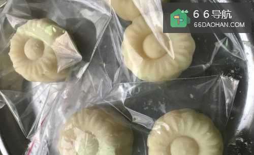 5同样的方法做,用冰皮包住馅料,一起弄成圆形,再用模具一压就可以脱模。