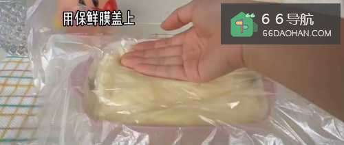 3将牛奶糊糊倒入容器里,用保鲜膜盖上,接着用手简单的按压一下后,放入冰箱冷藏3小时。