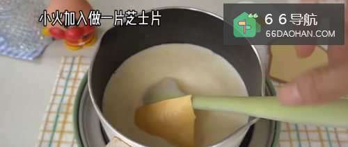 2小火熬煮,加入一片芝士片,一直搅拌至浓稠顺滑的程度即可。