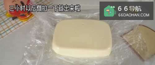 4冷藏时间到了之后,就把凝固的牛奶块拿出来,一个倒扣就完整的出来了,然后切成你想要的大小。