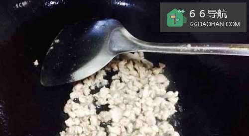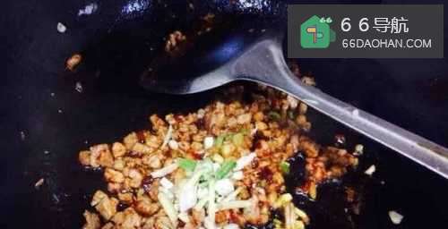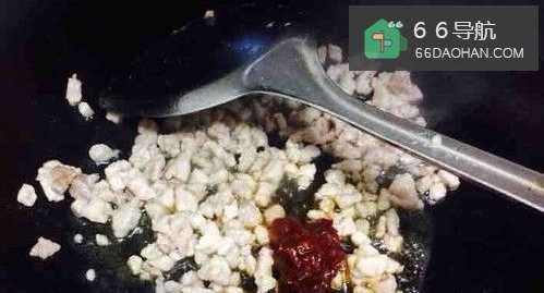 7炒至肉粒变色,加入一勺郫县豆瓣酱。
