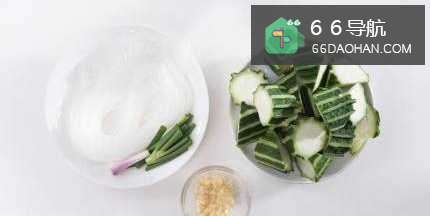 22、将粉丝浸软;蒜头切成蓉;葱切段;丝瓜去皮切件备用