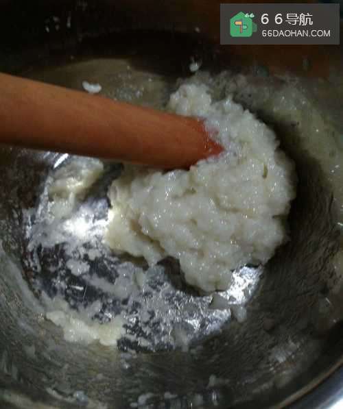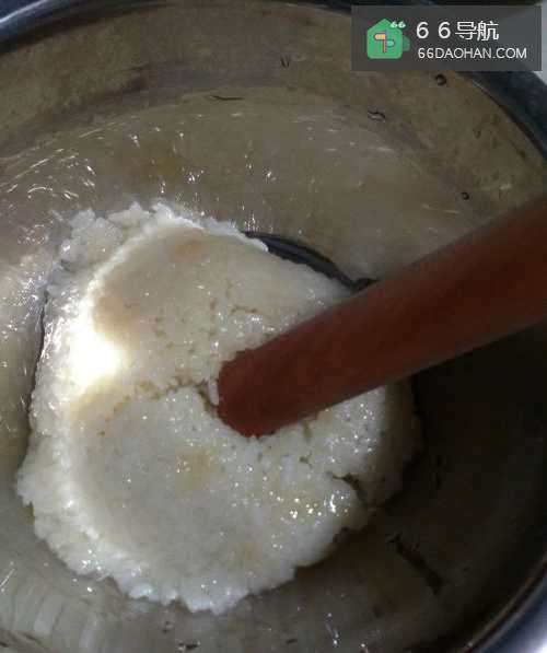 4把蒸熟的糯米倒入一个比较结实的能用来捣东西的容器中(比如不锈钢盆)然后用合适的工具捣碎(没错我用的擀面杖 挺好用的 也算是擀面杖新技能)