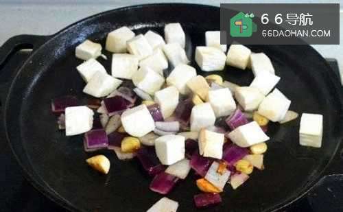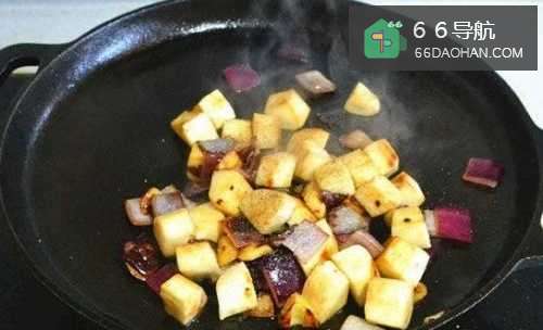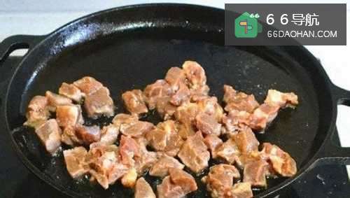 5起锅热油,放入腌制过的牛肉粒煎至变色盛出;