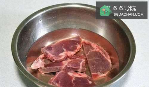 3牛肉切厚片,放入清水中浸泡1小时去除血水,中途换一次水;